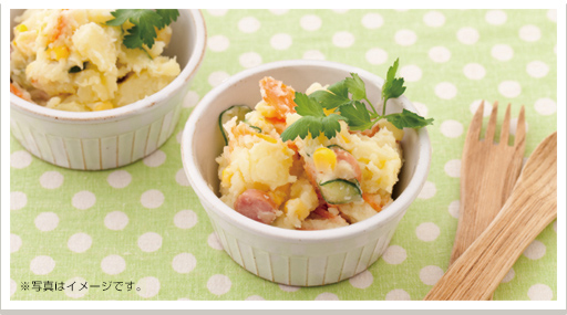 - 1.じゃが芋は皮をむいてひと口大に切り、さっと水にさらす。水から茹でるまたはラップで包み電子レンジで柔らかくなるまで加熱する。ボウルに入れ、じゃが芋が熱いうちに「カルピス」とコンソメを加え、粗く潰しながら和える。